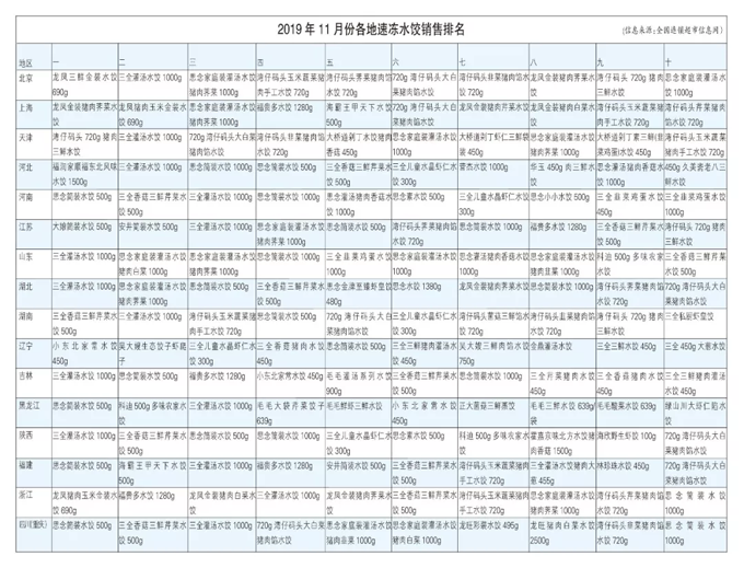 來源: 冷凍食品網 發布者:編輯2019年11月份各地速凍水餃銷售排名揭曉: